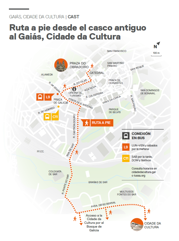 Route (return) | Cidade da Cultura – Multiusos Fontes do Sar – Piscinas – Fontiñas – Concheiros – Campo da Angustia – Rúa de Bonabal – San Roque – Virxe da Cerca – A Senra – San Clemente – Galeras – Santa Isabel – Casas Novas