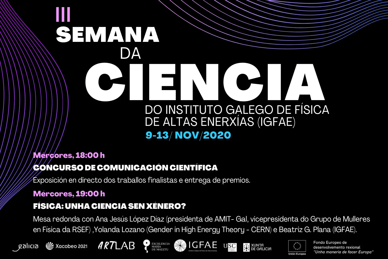 A III Semana da Ciencia do IGFAE celebrouse nun formato renovado, completamente virtual, que se retransmitiu en directo pola canle de Youtube do IGFAE (https://www.youtube.com/igfae/). Como a emerxencia sanitaria prohibiu desprazamentos e reunións de persoas, achegámonos a golpe de click a calquera persoa do planeta co obxectivo de dar a coñecer o labor investigador do Instituto e espertar a curiosidade pola ciencia e a física.
