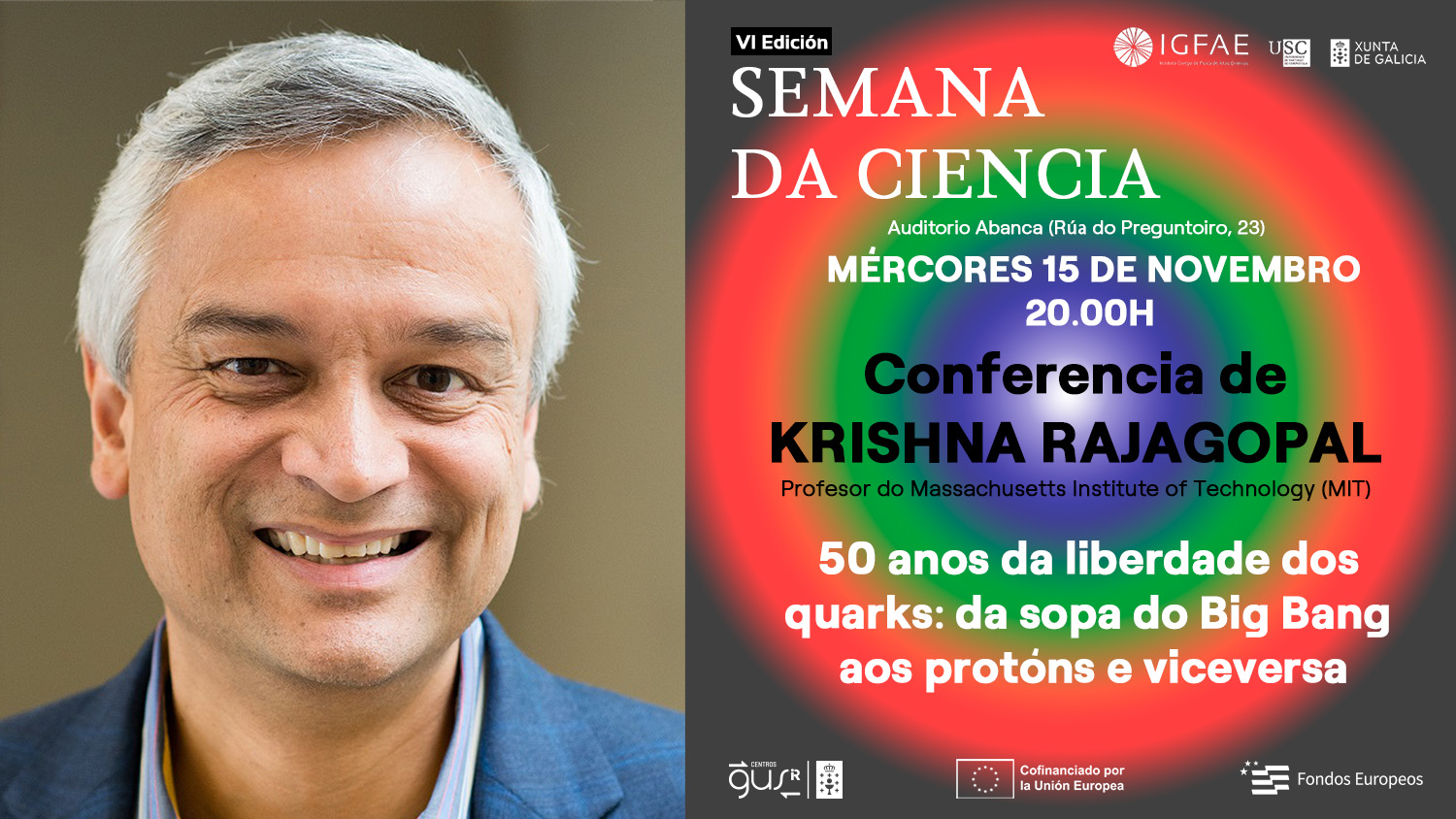 A VI Semana da Ciencia do Instituto Galego de Física de Altas Enerxías (IGFAE) terá o seu colofón este mércores 15 de novembro ás 20.00 horas (Auditorio Abanca, Rúa do Preguntoiro, 23), coa conferencia pública de Krishna Rajagopal, catedrático de Física Teórica do Massachusetts Institute of Technology (MIT). A charla será en inglés, con tradución simultánea ao castelán.