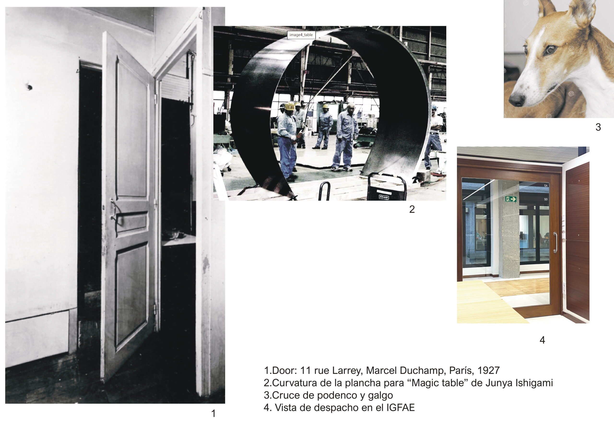 Marcel Duchamp construye, en su apartamento en París, algo semejante y diferente al mismo tiempo. Aunque se ha elaborado desde una necesidad práctica (responde a una cuestión de optimización del espacio) y por tanto es un objeto útil y funciona como puerta o puerta posible, él (su entorno) hace hincapié en el modo en que la puerta desafía la exactitud de una fórmula lingüística: “una puerta debe estar abierta o cerrada”. Tiene todos los componentes para ser denominada puerta (quicio, bisagras, marco, jambas, manilla, hoja, etc.), pero “falla” en el punto en que en lugar de funcionar con respecto a un único hueco, que conecta dos estancias, lo hace con respecto a dos huecos, que conectan tres. Lo que sucede entonces es que cuando la puerta está cerrada para un hueco permanece abierta para el otro o viceversa, y resulta imposible hacer encajar el artilugio dentro de esa fórmula: la puerta está abierta y cerrada simultáneamente.